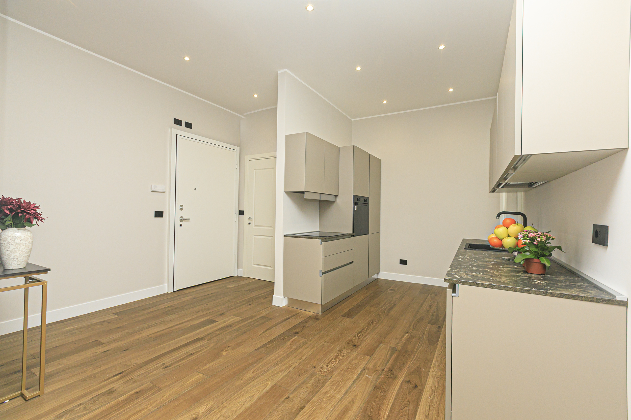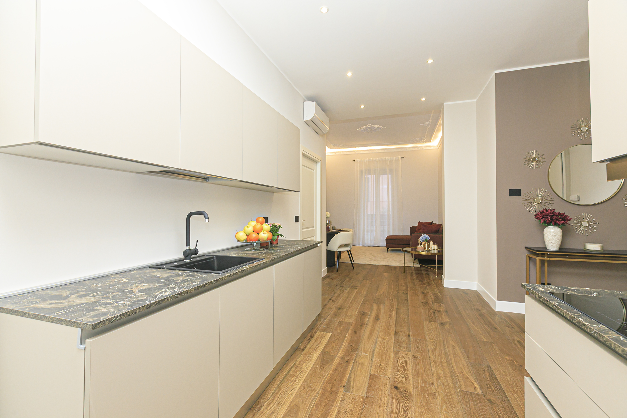 ingresso in ampio SOGGIORNO OPEN SPACE con CUCINA A VISTA e balconcino, elegante CAMERA MATRIMONIALE, BALCONATA vivibile, seconda camera da letto, BAGNO dotato di box doccia e vasca freestanding, DISPENSA/LAVANDERIA.